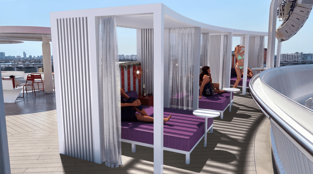 Bask in the sun in style with our VIP Cabanas on Deck 16. Where luxury meets leisure in the perfect getaway. These premium bookable cabanas are perfectly perched above the pool, providing a stunning view for that ultimate see-and-be-seen vibe. Whether you’re soaking in the rays solo, enjoying a peaceful retreat with a book in hand. Bringing the whole crew for a lively day of fun, these cabanas offer the ideal sanctuary. With the option to connect multiple cabanas. You can create your very own private chill spot in the heart of the action. Complete with plush seating, refreshing beverages, and personalized service. Indulge in a day of relaxation and entertainment, surrounded by friends and the sparkling waters below. Making memories that will last a lifetime.